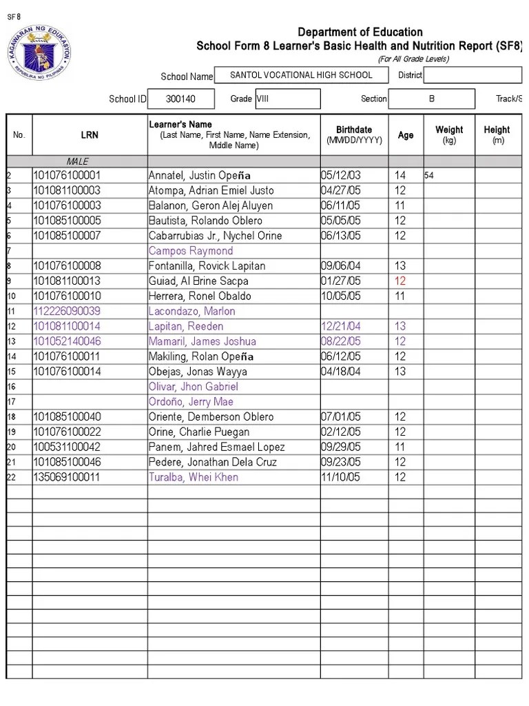 School Form 8 SF8 Learner Basic Health and Nutrition Report PDF