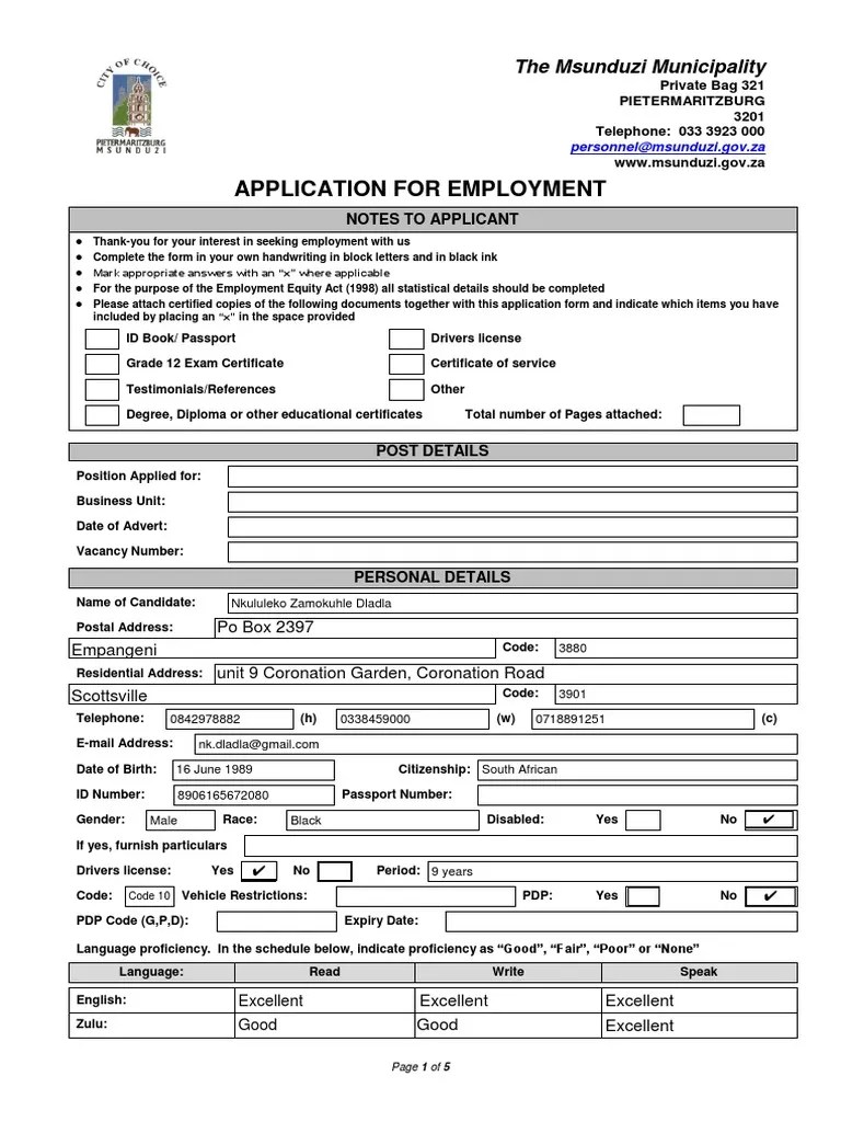 Msunduzi Application Form. PDF Institute Of Technology Employment